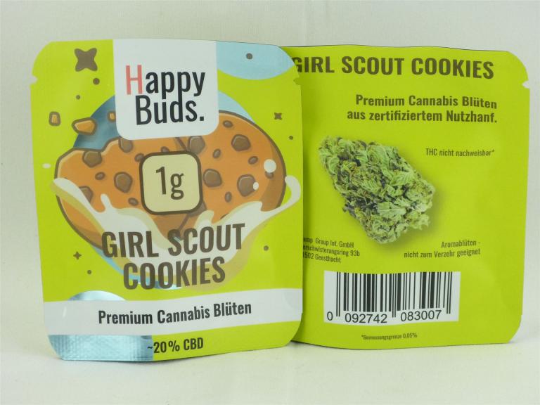 Girl Scout Cookies - Premium CBD Blüten von HappyBuds, ca. 20% CBD, THC nicht nachweisbar (Bemessungsgrenze 0,05%), Mit natürlichen Terpenen terpenisiert und erhöhtem CBD Gehalt, Terpenprofil: Süß Würzig Pinie, Aus EU-zertiviziertem Nutzhanf, Abgabe erst ab 18 Jahren (festgestellt durch DHL, unseren eigenen Lieferdienst oder unser Verkaufspersonal), Verfügbar in 1g und 3g