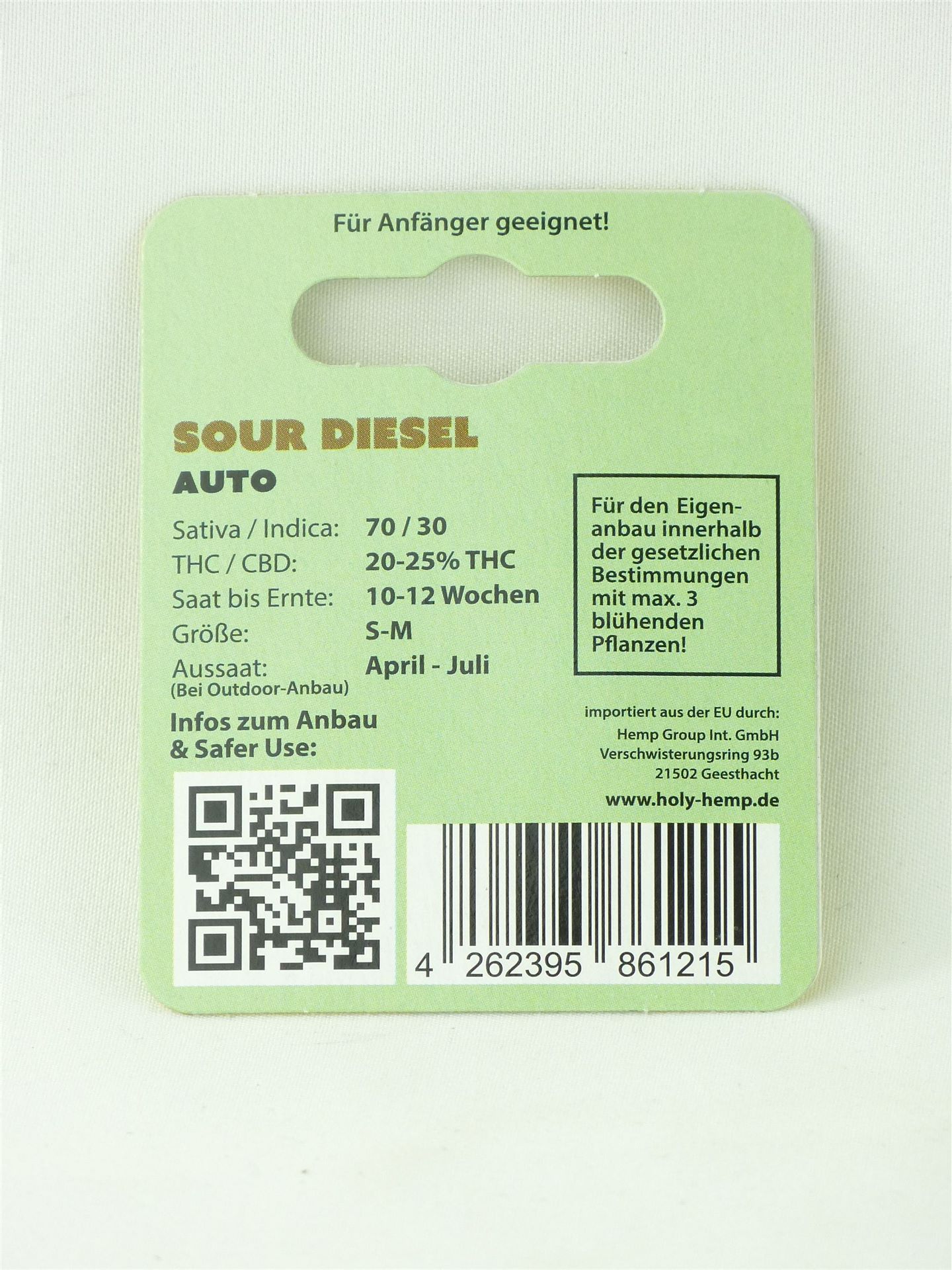 Auto Flowering, US Cali Seeds, 70% Sativa / 30% Indica, 20-25% THC, Saat bis Ernte: 10-12 Wochen, Größe: S-M, Aussaat (Bei Outdoor-Anbau): April-Juli, Abstammung: Sour Diesel x Sour Diesel Auto. Auf der Rückseite jeder Holy Hemp Verpackung findest du einen QR-Code, um dich über den Anbau zu informieren. Keine Abgabe an Personen unter 18 Jahren. Feststellung der Volljährigkeit durch unser Personal, bei Zustellung durch unseren eigenen Lieferdienst oder via DHL.