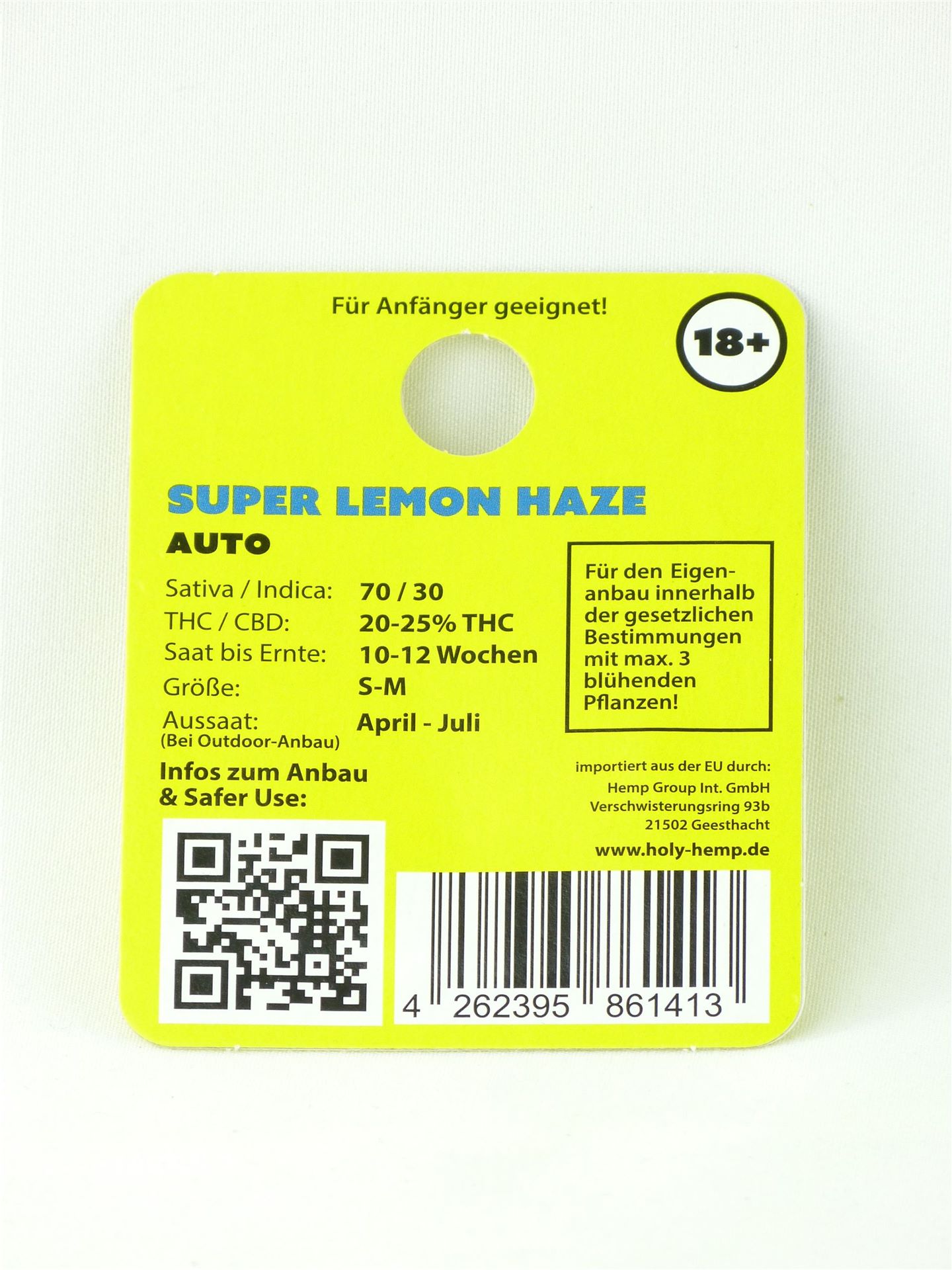 Auto Flowering, 70% Sativa / 30% Indica, 20-25% THC, Saat bis Ernte: 10-12 Wochen, Größe: S-M, Aussaat (Bei Outdoor-Anbau): April-Juli, Abstammung: Lemon OG Kush x Orginal Haze x White Window. Auf der Rückseite jeder Holy Hemp Verpackung findest du einen QR-Code, um dich über den Anbau zu informieren. Keine Abgabe an Personen unter 18 Jahren. Feststellung der Volljährigkeit durch unser Personal, bei Zustellung durch unseren eigenen Lieferdienst oder via DHL.