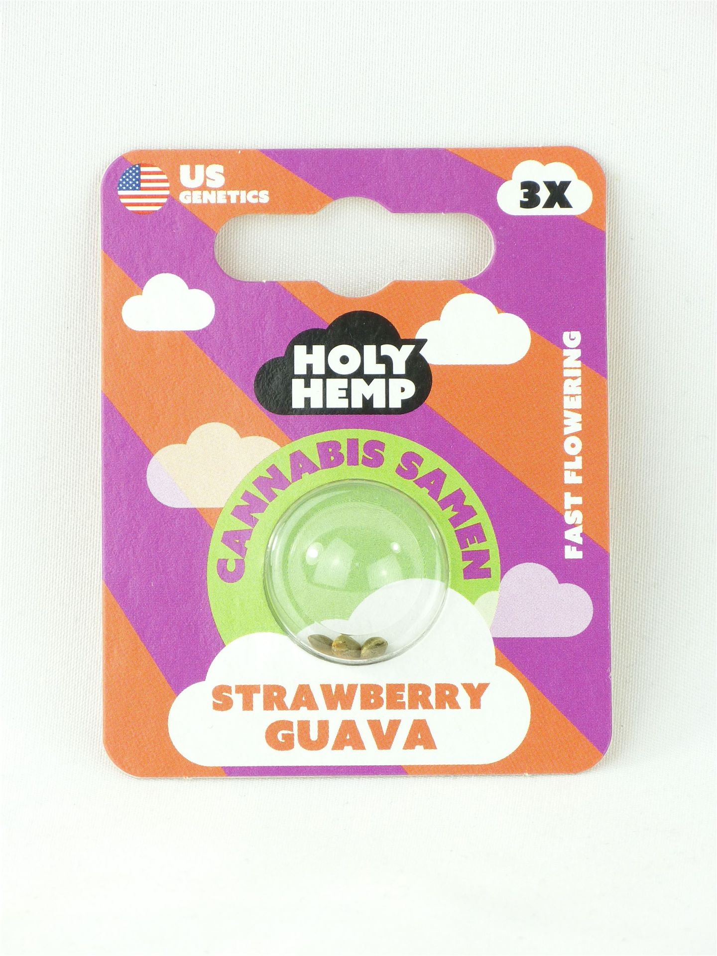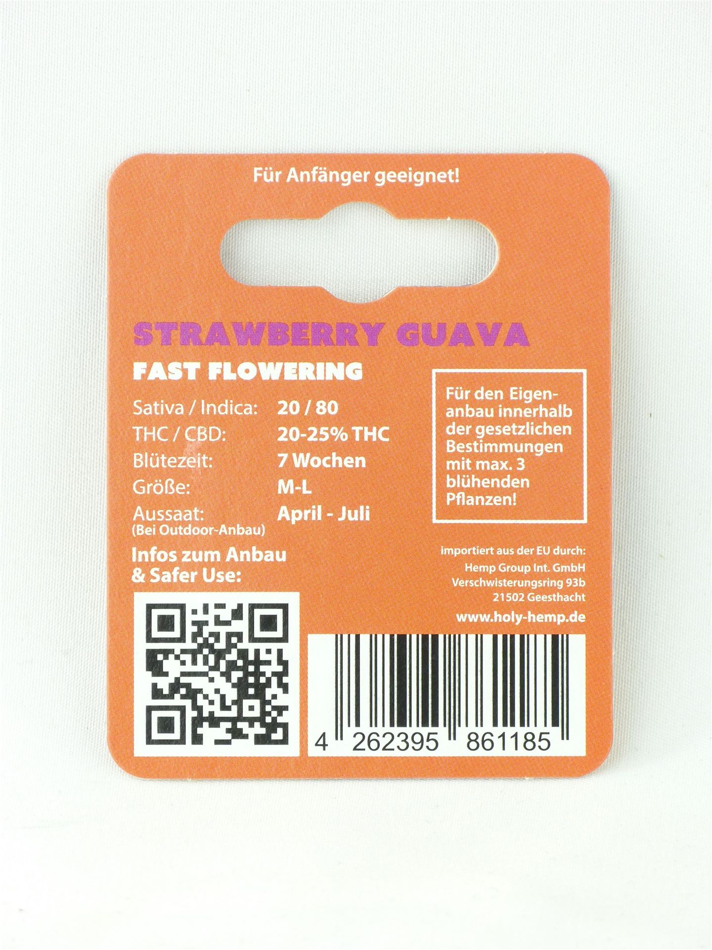 Fast Flowering (photoperiodisch), US Cali Seeds, 20% Sativa / 80% Indica, 20-25% THC, Saat bis Ernte: 7 Wochen, Größe: M-L, Aussaat (Bei Outdoor-Anbau): April-Juli, Abstammung: Strawberry Guava x Marathon OG F4. Auf der Rückseite jeder Holy Hemp Verpackung findest du einen QR-Code, um dich über den Anbau zu informieren. Keine Abgabe an Personen unter 18 Jahren. Feststellung der Volljährigkeit durch unser Personal, bei Zustellung durch unseren eigenen Lieferdienst oder via DHL.