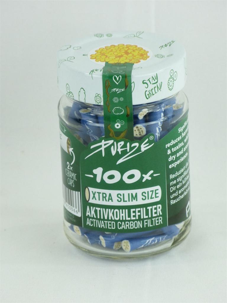 PURIZE® Glas mit 100 XTRA Slim Size Ø 6mm, durch das Glas bleiben Deine Filter natürlich vor äußeren Umständen geschützt. Hochwertige Aktivkohlefilter, Filtertyp: XTRA Slim Size, Filterstyle: Blau, Verpackungsgröße: 100er