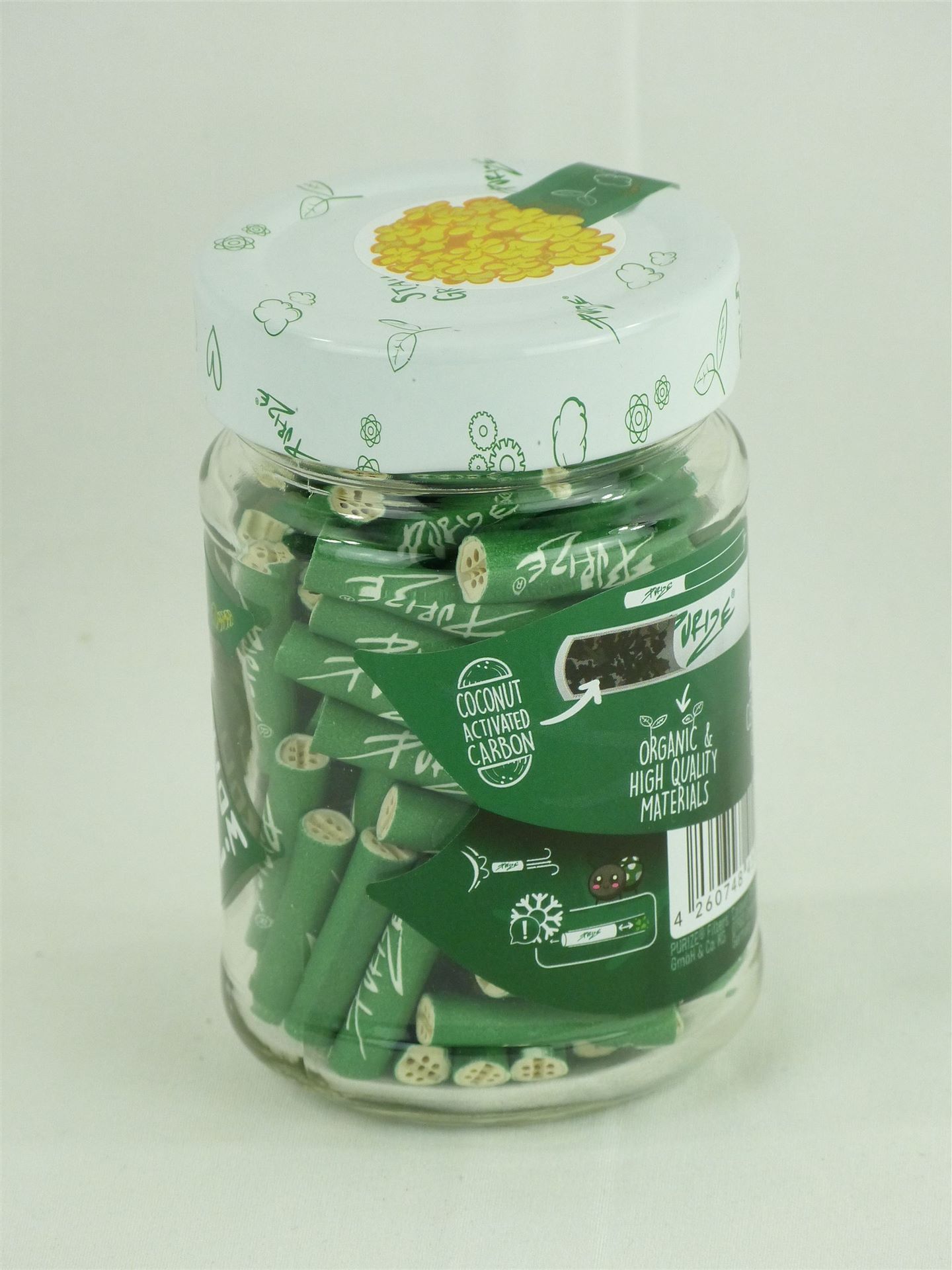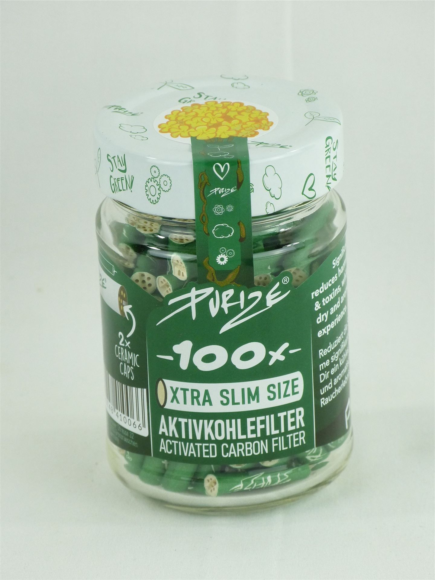 PURIZE® Glas mit 100 XTRA Slim Size Ø 6mm, durch das Glas bleiben Deine Filter natürlich vor äußeren Umständen geschützt. Hochwertige Aktivkohlefilter, Filtertyp: XTRA Slim Size, Filterstyle: Grün, Verpackungsgröße: 100er