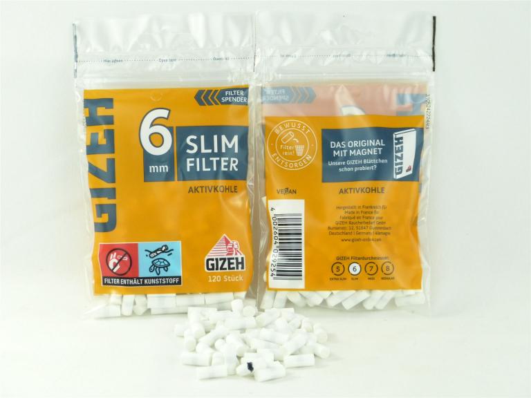 In diesen GIZEH Eindrehfilter sind Aktivkohle Partikel enthalten. Die natürliche Aktivkohle in den 6mm Filtern verschafft eun sanfteres Aroma. Die Filter sind im Beutel zu 120 Stück verpackt und können einzeln über das Spenderloch entnommen werden. Länge 15mm, Ø 6mm.