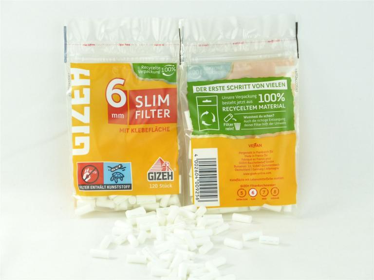 GIZEH Slim Filter, Ø6mm länge 15mm - Die beliebtesten Eindrehfilter für deinen Genuss. Um das Drehen zu erleichtern, verfügen die Filter über eine Klebefläche für besseren Halt. Die Filter sind verpackt zu je 120 Stück in einem Beutel mit Zip-Verschluss. Die Filter können aber auch einzeln über das praktische Spenderloch entnommen werden.