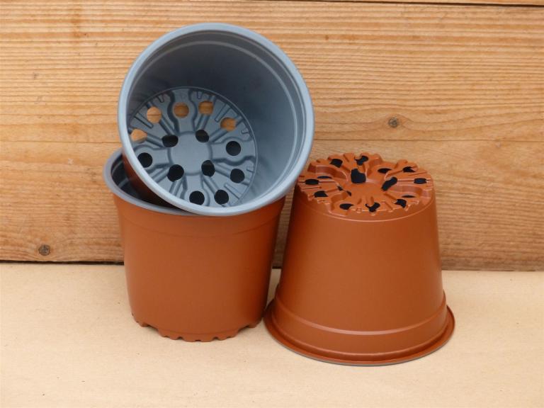 Plastikrundtopf Ø13cm Tonfarben 8° zur Umpflanzung nachdem die Pflanze den 9er Topf gut durchwurzelt hat.