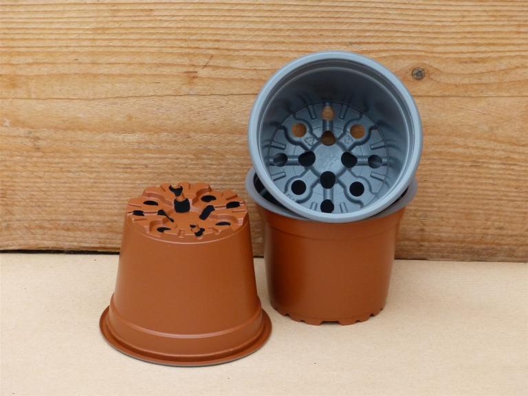 Plastikrundtopf Ø9cm innen Tonfarben, außen terra 8° zum legen der Samen in Aussaaterde.