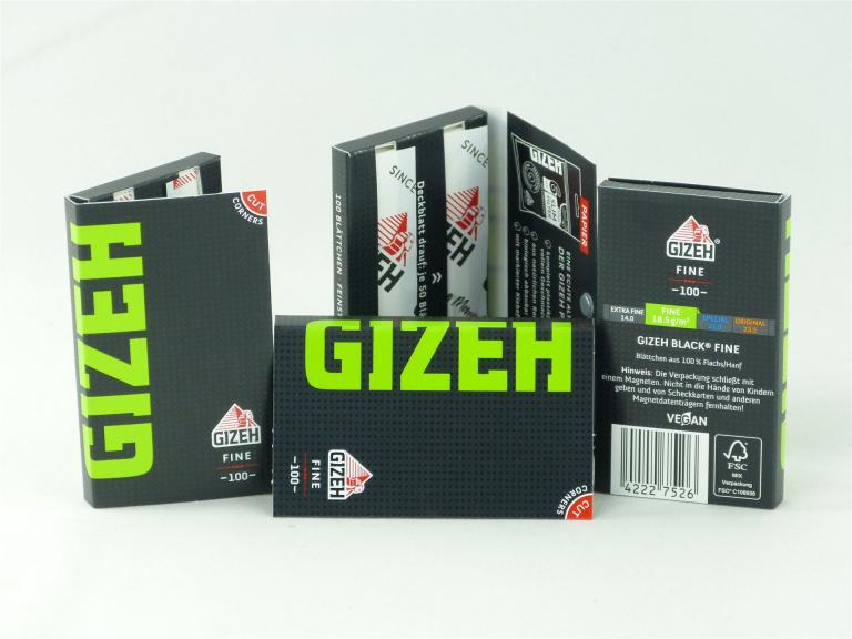 Das beliebteste Blättchen für deinen Genussmoment GIZEH BLACK® Fine. Ein besonders feines Blättchen mit einem Flächengewicht von 18,5g / m² und einer natürlichen Gummierung aus Gummiarabikum. Das Blättchen ist aus 100% aus Flachs und Hanf hergestellt und sorgt für puren Tabakgenuss. Jede Packung enthält 100 Blättchen und ist mit dem GIZEH Magnetverschluss ausgestattet. Die gesamte GIZEH BLACK® Produktreihe ist nicht nur vegan, sondern stammt auch aus euner verantwortungsvollen Forstwirtschaft und ist mit dem FSC-Siegel versehen.